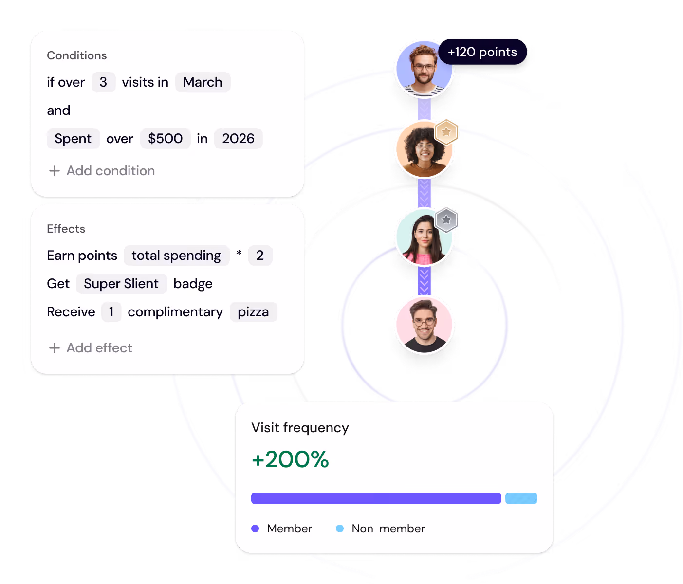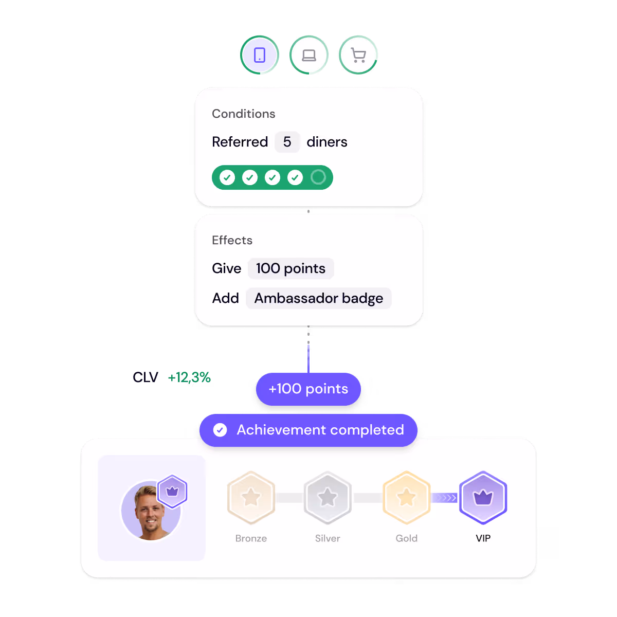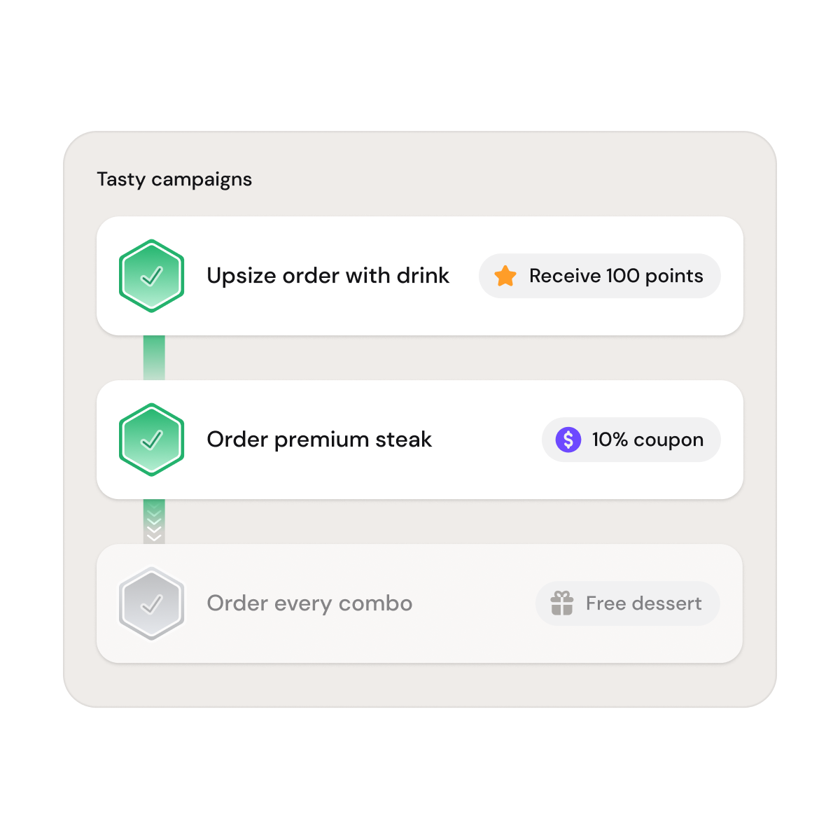 Use streaks, badges, and visit-based milestones to make every transaction feel like progress. Design gamification campaigns to reward frequent visits during specific dayparts, securing the daily routine of your guests.