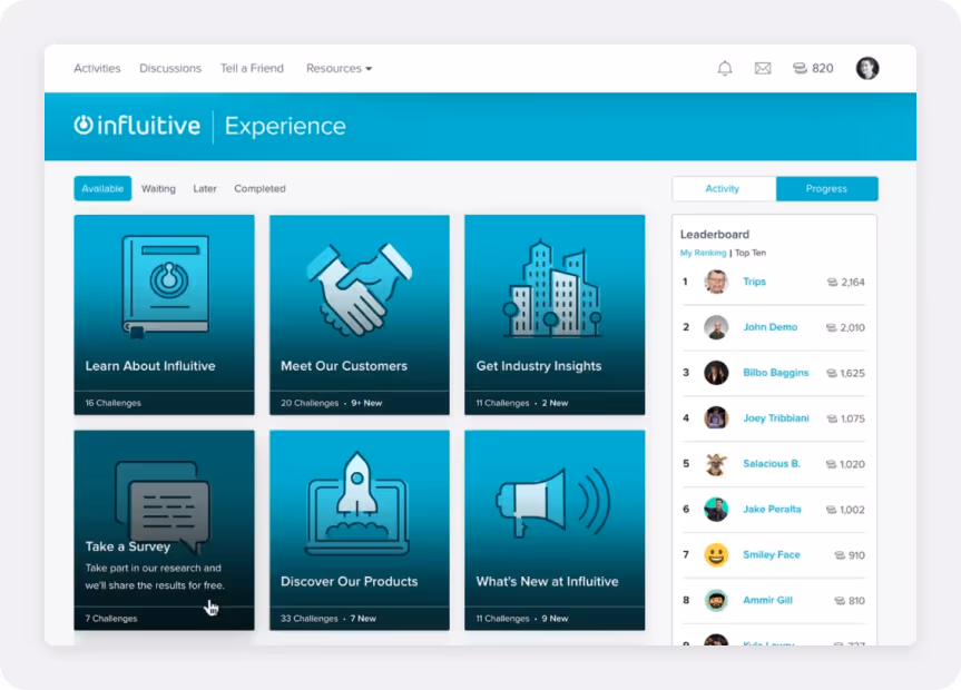 Influitive is a gamification platform focused on customer advocacy and community-driven engagement, primarily in B2B environments. Programs are designed around actions such as writing reviews, sharing referrals, providing testimonials, or taking part in community discussions.