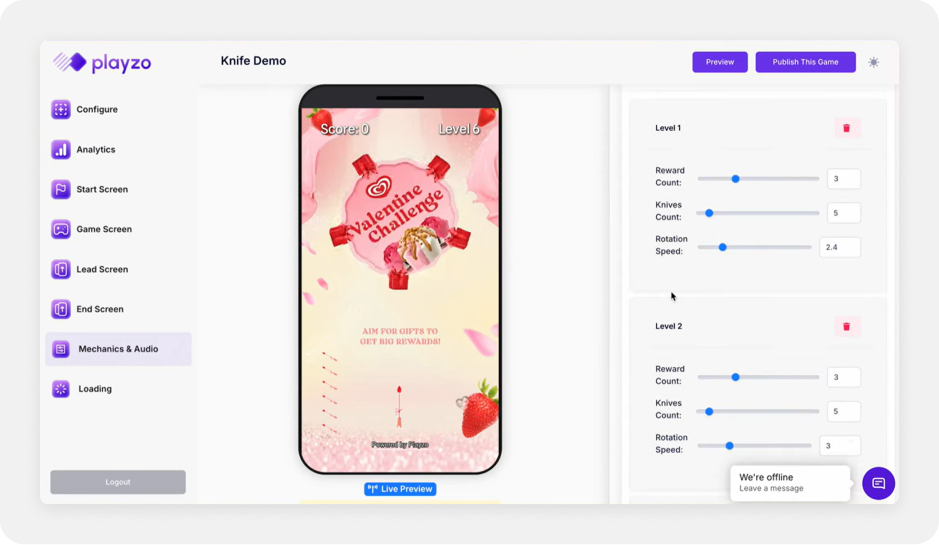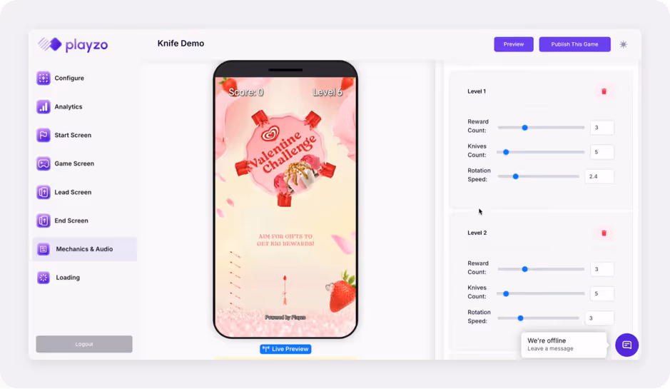 The platform centers on real-time mechanics such as challenges, tournaments, and interactive games. These elements are configured through a visual interface and are often used to create short engagement loops inside customer-facing channels, especially during campaigns or promotional moments.