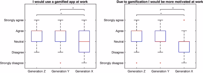 Participants from Generations Z and Y were more willing to use gamified systems and more likely to say that gamification leads to increased motivation, while Generation X showed more hesitation. Preferences for specific mechanics also varied. Avatars were well received across all age groups, badges resonated more with younger employees, and leaderboards appealed mainly to Generation Z.