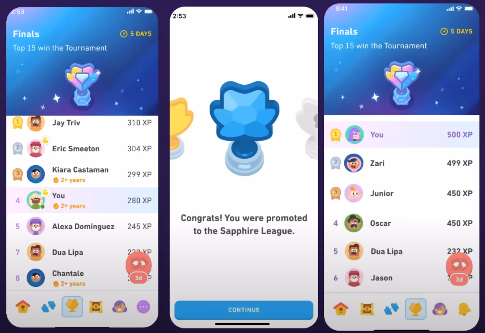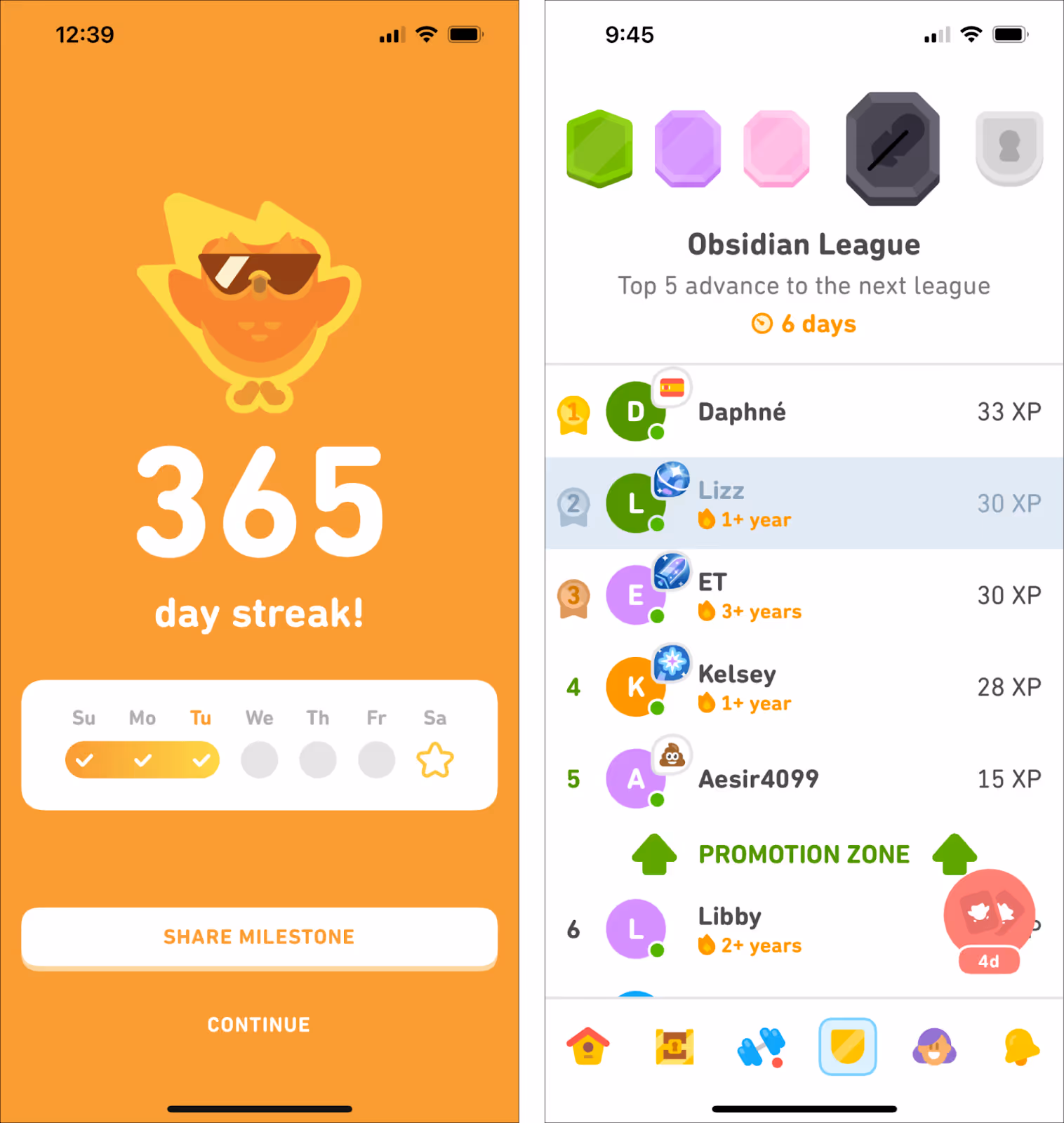 Each user is placed in a 30-person group and ranked based on total XP earned that week.