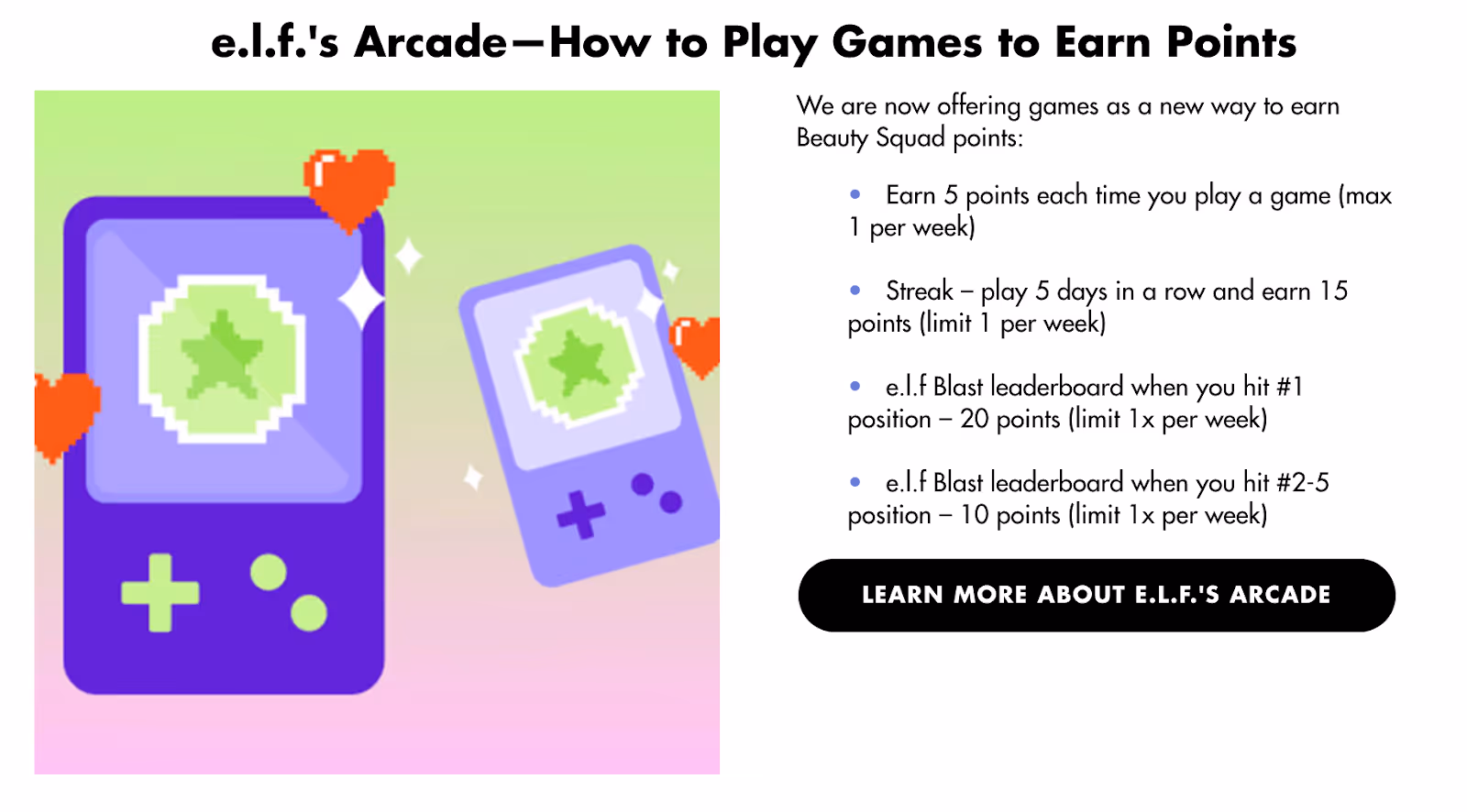 The app experience was branded as the e.l.f. Arcade, featuring games like e.l.f. Blast (a match-3 puzzle game), timed challenges, and point-earning missions. The more users played and interacted, the higher they moved up on the weekly leaderboard, and the more loyalty points they racked up.