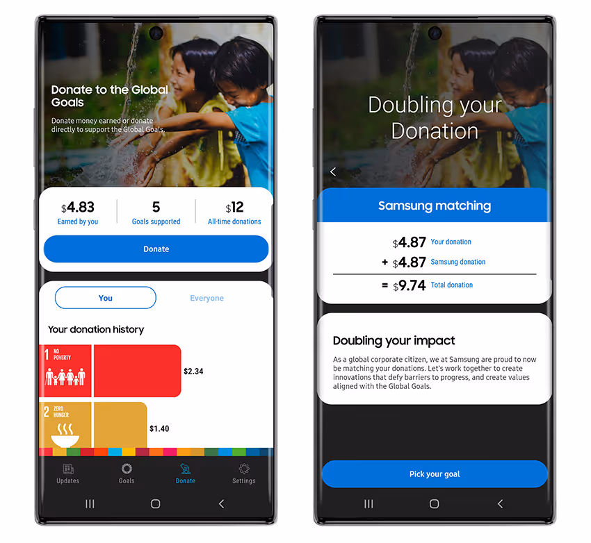 Samsung's Global Goals app, developed with the UN, helps Galaxy users donate to 17 sustainable development causes. In 2023, Samsung added a Donation Leaderboard feature, turning charitable giving into a friendly, app-based competition.Â