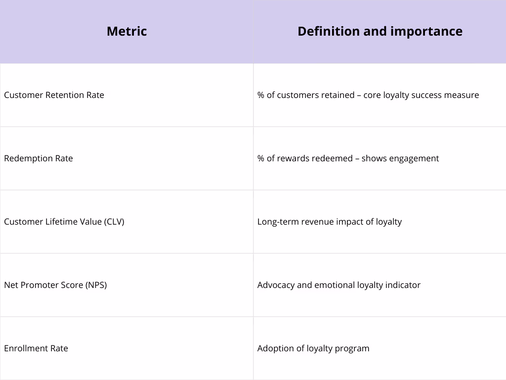 You measure success by tracking KPIs like customer lifetime value (CLV), retention rate, redemption rate, and engagement. A rise in CLV, more repeat customers, and higher customer satisfaction scores all indicate loyalty success.